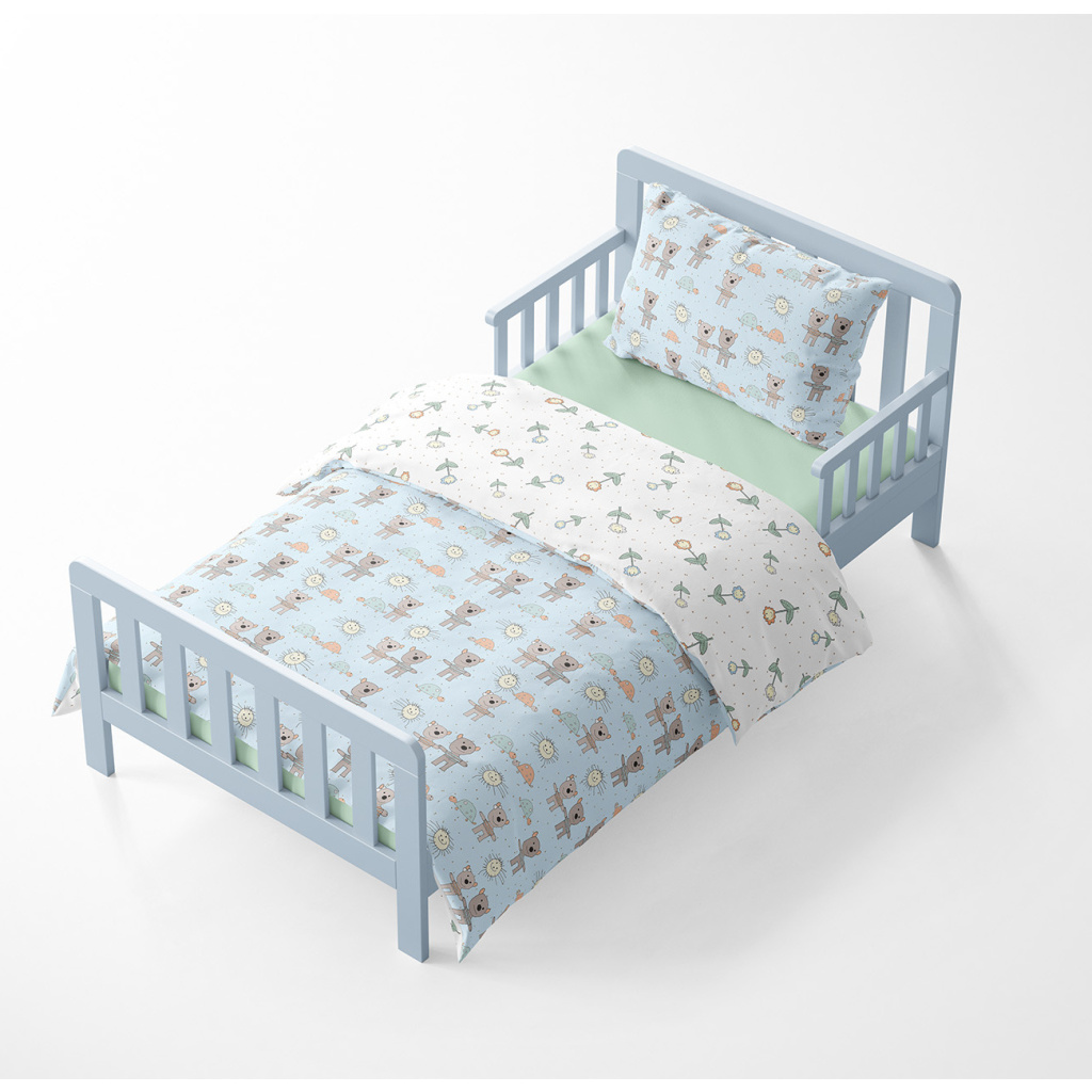 Baby crib bedding – Teddy bear and turtle – light blue/white
